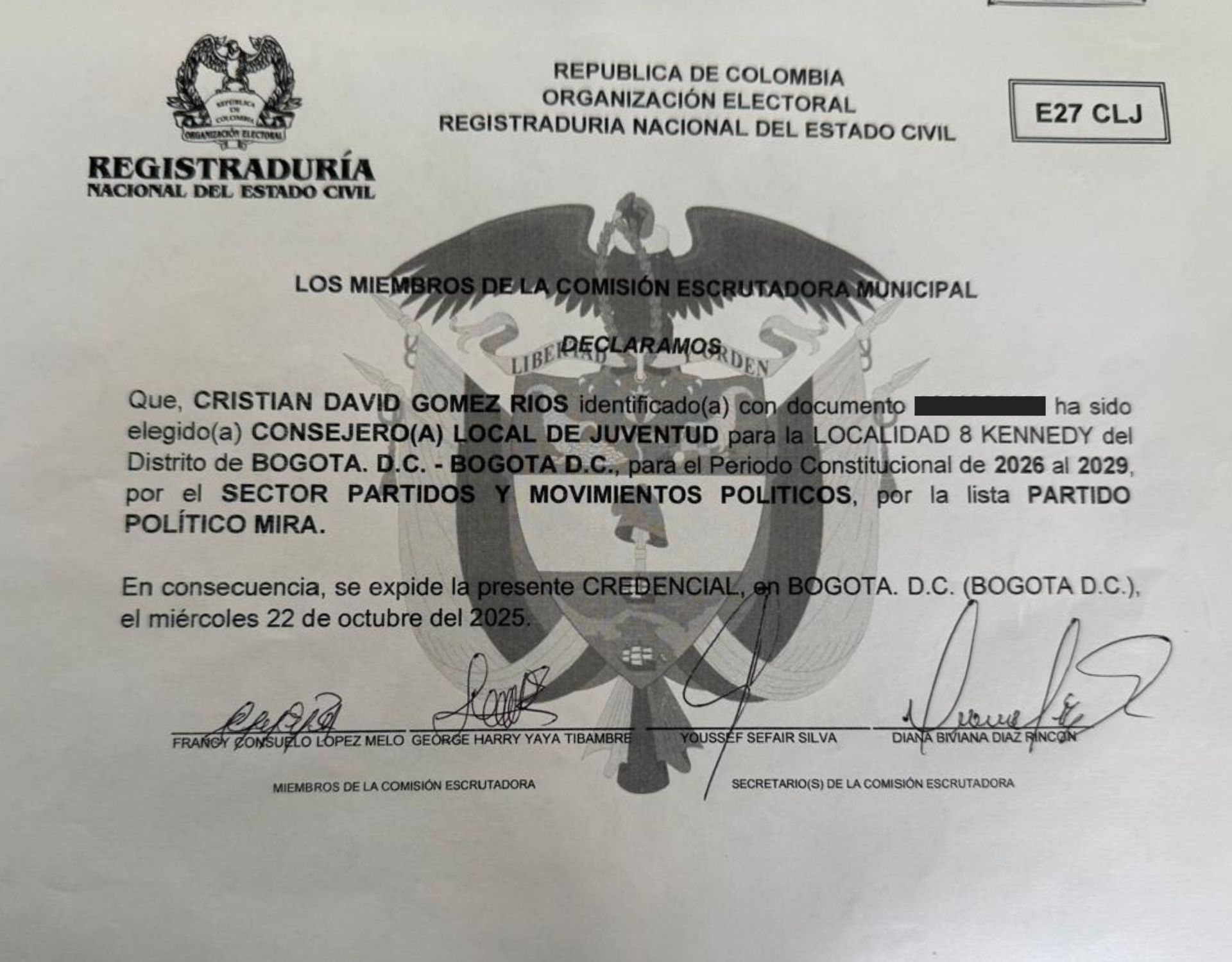 Felicitamos a nuestro estudiante Cristian David Gómez Ríos, quien fue elegido como Consejero Local de Juventud en la localidad de Kennedy (Bogotá D.C.), representando al Movimiento Político MIRA. Este logro refleja su liderazgo, compromiso y vocación de servicio.