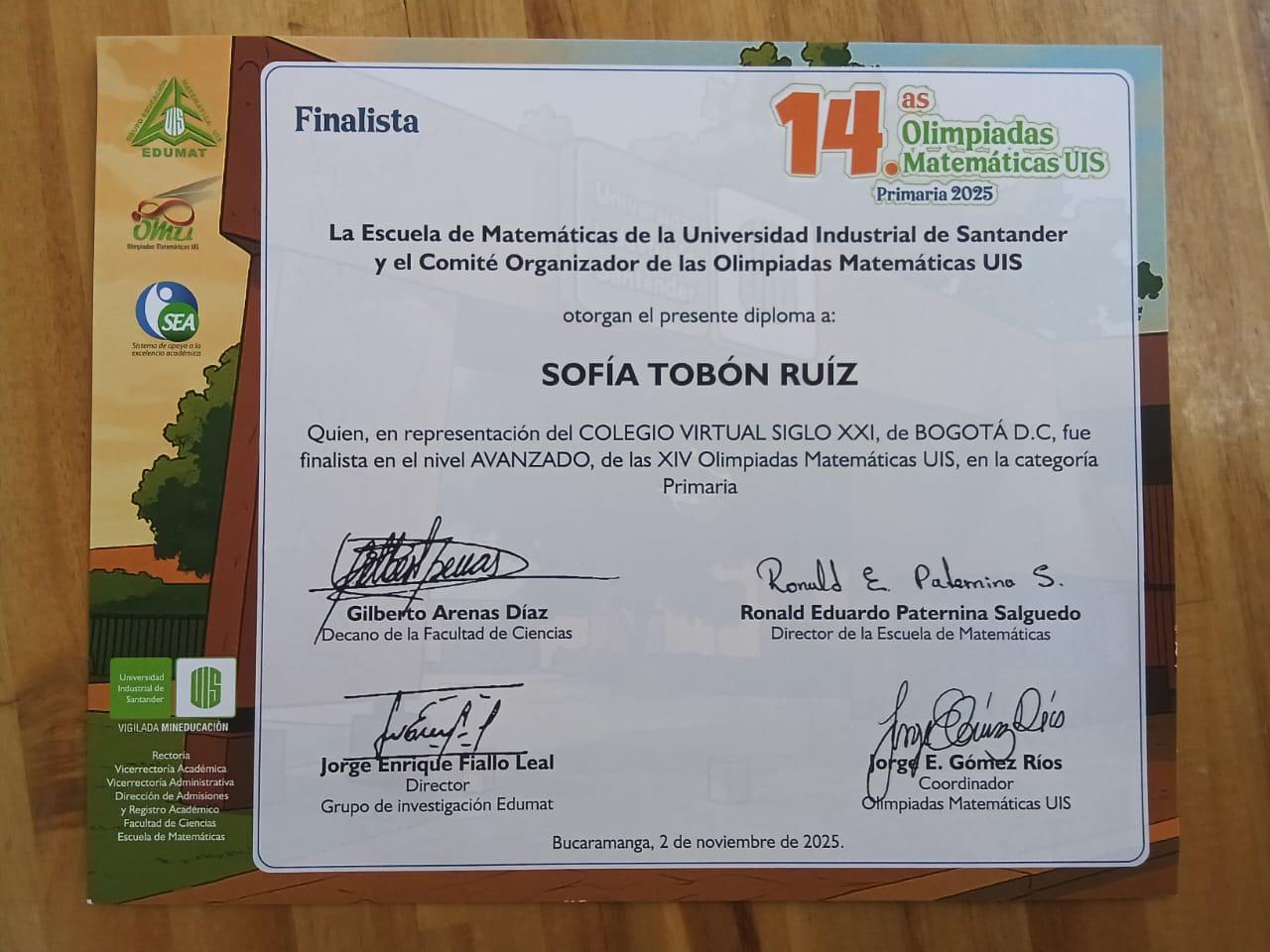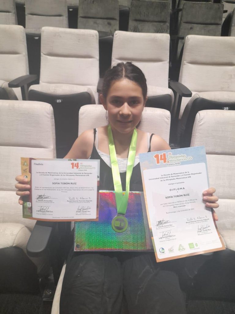 Felicitamos a Sofía Tobón Ruiz, estudiante de quinto grado virtual, por obtener la medalla de plata en las XIV Olimpiadas Matemáticas UIS, un certamen organizado por la Escuela de Matemáticas de la Universidad Industrial de Santander y el comité de las Olimpiadas Matemáticas UIS. Este reconocimiento refleja su disciplina, curiosidad intelectual y amor por los números, cualidades que inspiran a toda nuestra comunidad educativa. Su logro es una muestra del talento y compromiso que distinguen a los estudiantes del Colegio Virtual Siglo XXI. ¡Felicitaciones, Sofía, por dejar en alto el nombre de nuestra institución!